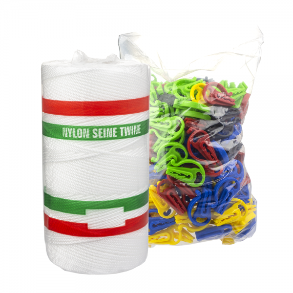 Inclui rolo de fio com 275metros de comprimento em Nylon na cor branca + sacos de 250 unidades de clips, cores mistas (azul, amarelo, vermelho, verde e preto).